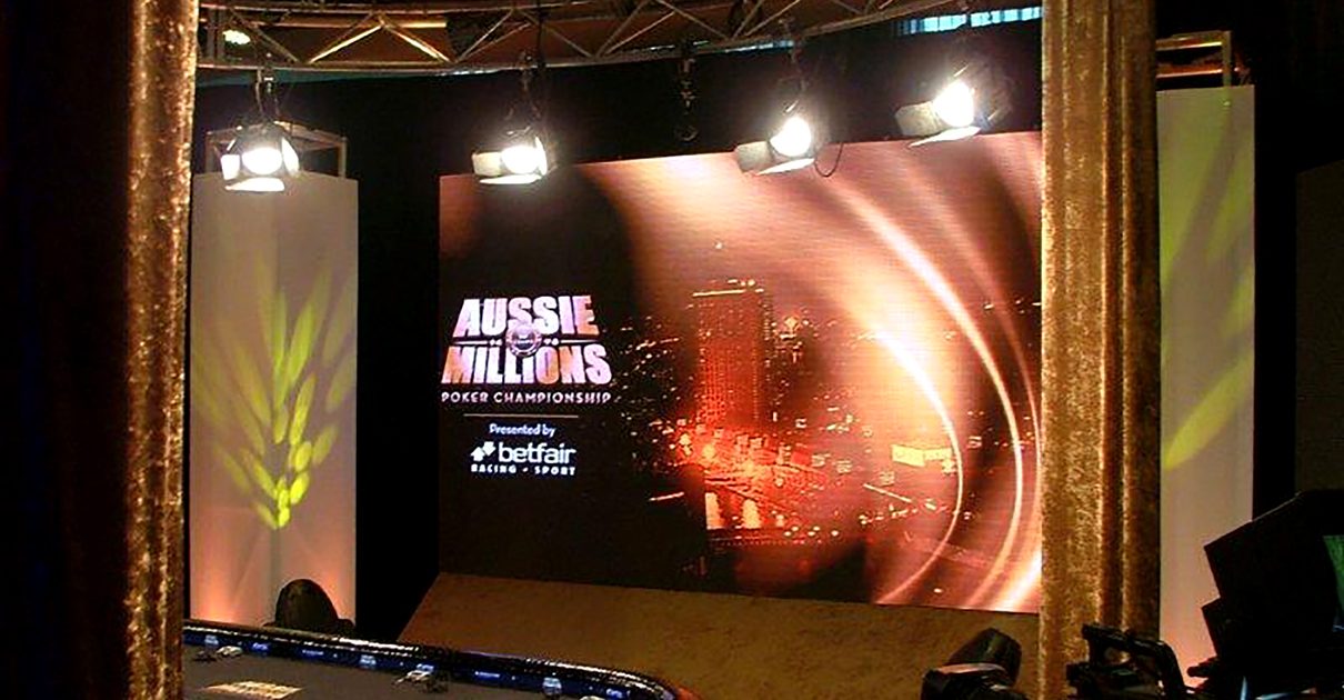 /in Uncategorized /by Serversaurus SupportClifton Productions recently supplied the set, lighting and LED screens for the Aussie Millions Poker at Crown Casino in Melbourne. Four large VuePix 6mm LED screens where positioned around the poker table. Streaming images and graphics throughout the entire program. The footage from the show will be edited in the US and broadcasted through Foxtel channels.