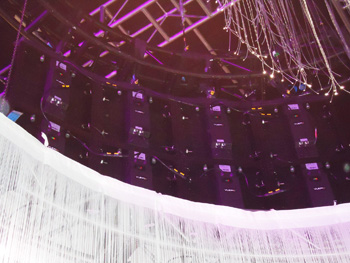 28 x Robe ColorSpot 1200AT and 24 x Robe ColorWash 1200AT’s were used for room washing and rigged above the triangular stage. Also rigged, hanging from the fingers above the stage were 6 x Robe ColorSpot 700EAT along with 31 x iLED LEDSource 36’s for multi colour stage washing. 8 x iLED ColorBank 54’s were placed inside cones to illuminate up these set pieces.