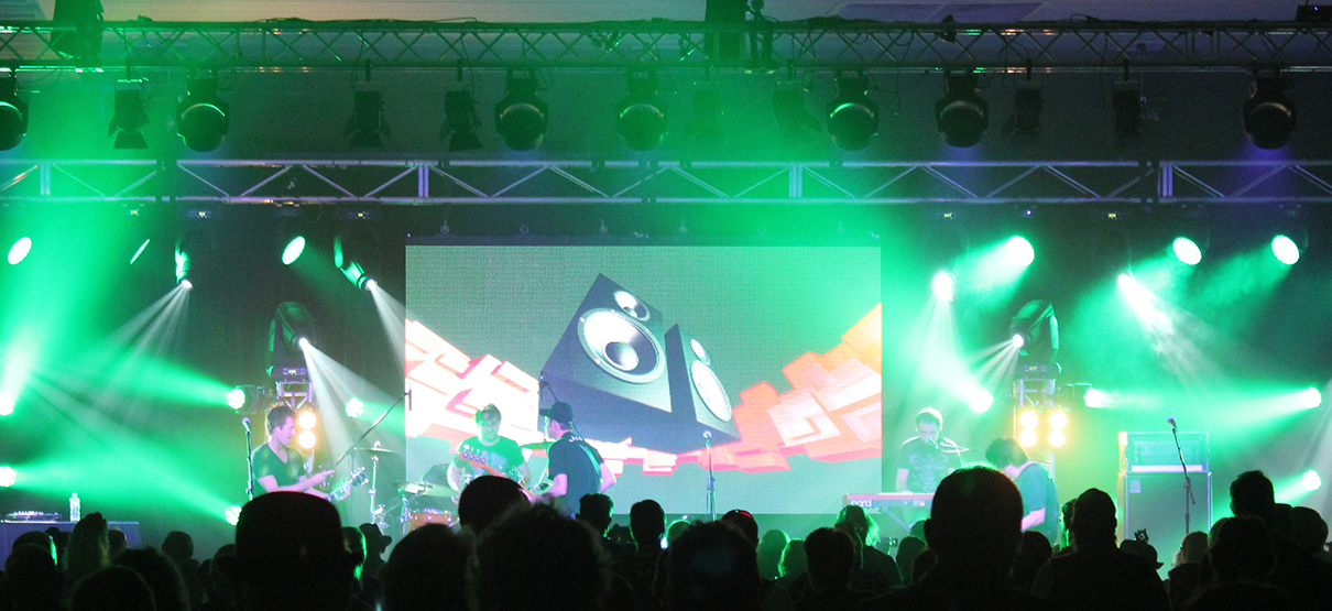 On the back of the stage 10 x iLED Star Drapes were installed with a VuePix P10 display of 12 panels behind the band stage. This was driven by Catalyst media server and switched from the generic holding slide to funky graphics for each of the performances on stage.