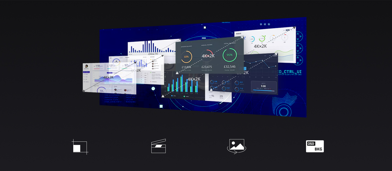 The H series supports up to 16 HD layers per output slot with an unrestricted arrangement. The layers can be positioned freely across different output loading areas or within the same output, while keeping the layer size the same. Layers can be in any position, overlapped or scaled. The system supports other layer functions such as image capture, layer rotation, and more.