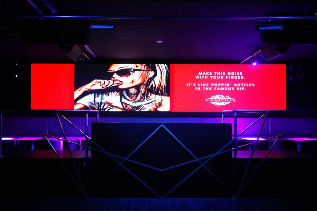 Eight meters wide and 1.5m high screen, spanning across the whole wall behind the DJ in an area for privileged guests, has become a perfect platform for creating unique club looks and setting up the vibes for each night, as well as for promoting club’s partners, sponsors and upcoming events.
