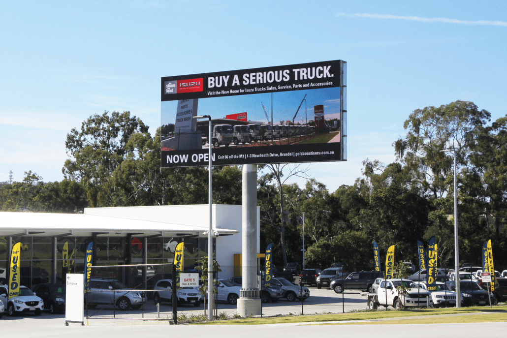 A digital billboard super-screen installed at the Frizelle Sunshine Isuzu Centre next to the busy M1 highway.