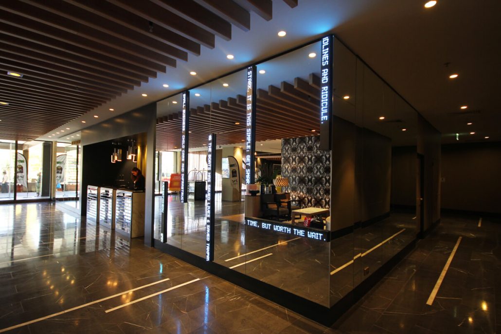 TheVuePix messaging system has been installed within the QT Hotel foyer and informs hotel guests of current world news.