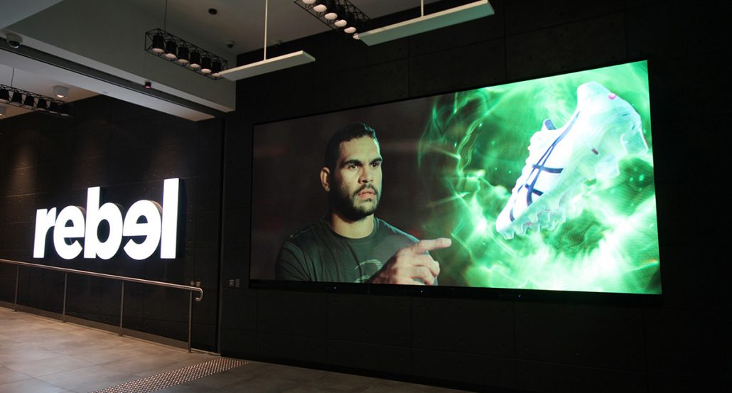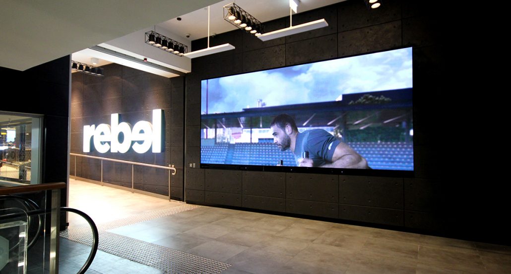 The Rebel Sports store in Westfield Shopping Centre Bondi in Sydney benefits from the new VuePix HD Screen, being used for a multitude of applications including in-store commercials.