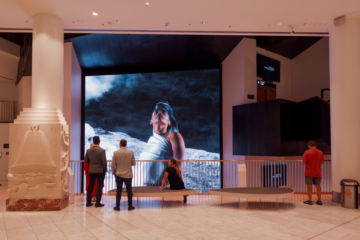 A large-scale digital artwork by renowned New Zealand artist Lisa Reihana has been installed in the Aotea Centre foyer, immersing visitors in a visual spectacle, telling the traditional Māori story of the origins of our world.