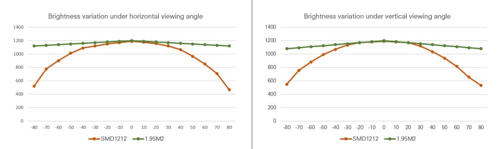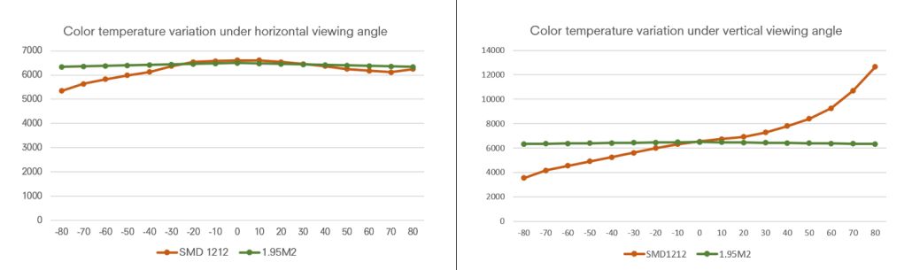 In the 160 degrees horizontal and vertical viewing angle range, 1.95M2 LED chip maintains more consistent colour temperature than conventional LEDs.