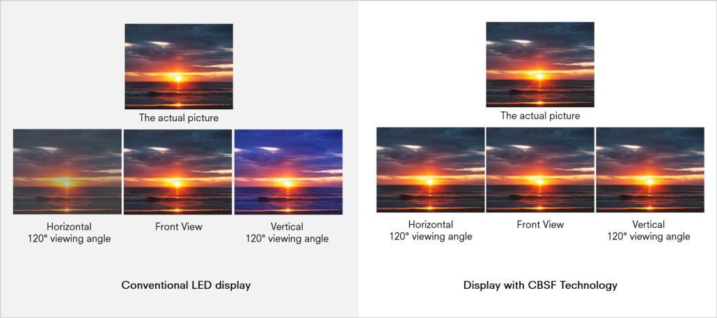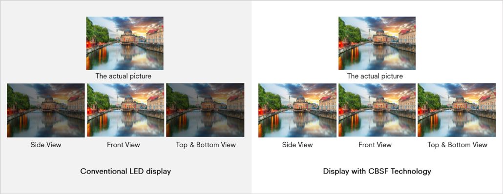 When deviating from the optimal viewing angle using conventional LED, the image may appear darker, while CBSF technology solves the problem of inconsistent